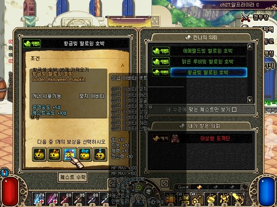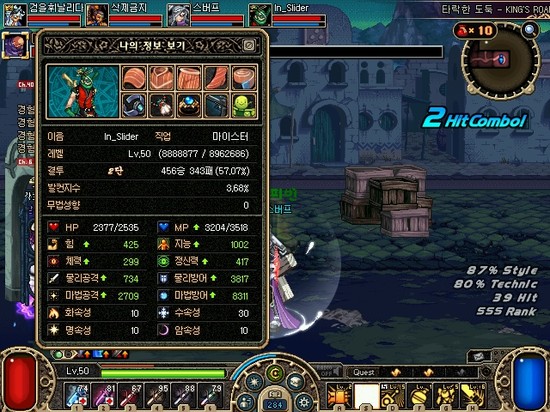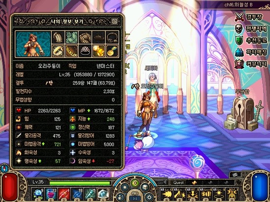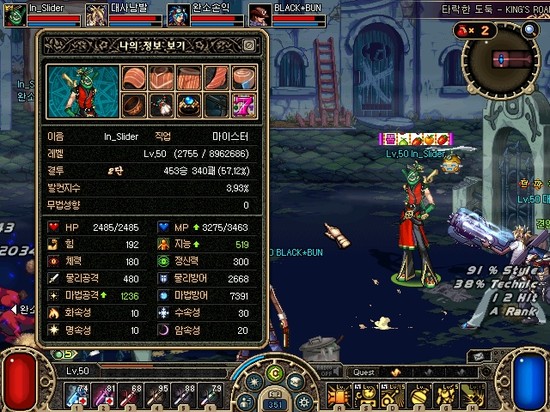 세트아이템을 맞추고 샤이닝 볼트 +7강을 껴주니 지능과 마법공격이 떡상했어요!