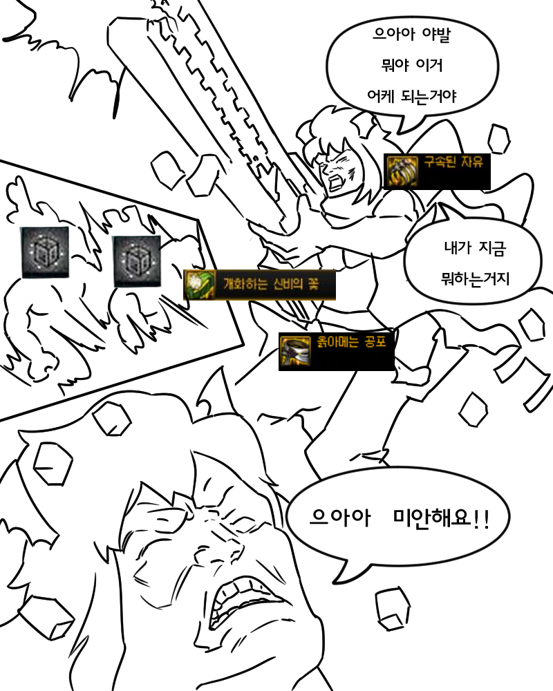마지막은 깊게 생각하지 않고 무큐를 잘 죽이는 에픽들을 꼈다가 느낀 점을 패러디로 그려봤습니다!