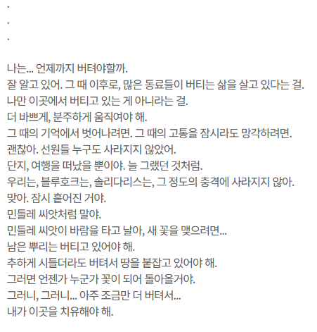 사실 단델이 의료진이다보니까 스토리 이후에도 제일 바쁘게 뛰어다닐거 같긴 하지만 그러면 너무 눈물나니 잠깐이나마 쉬었으면 하네요