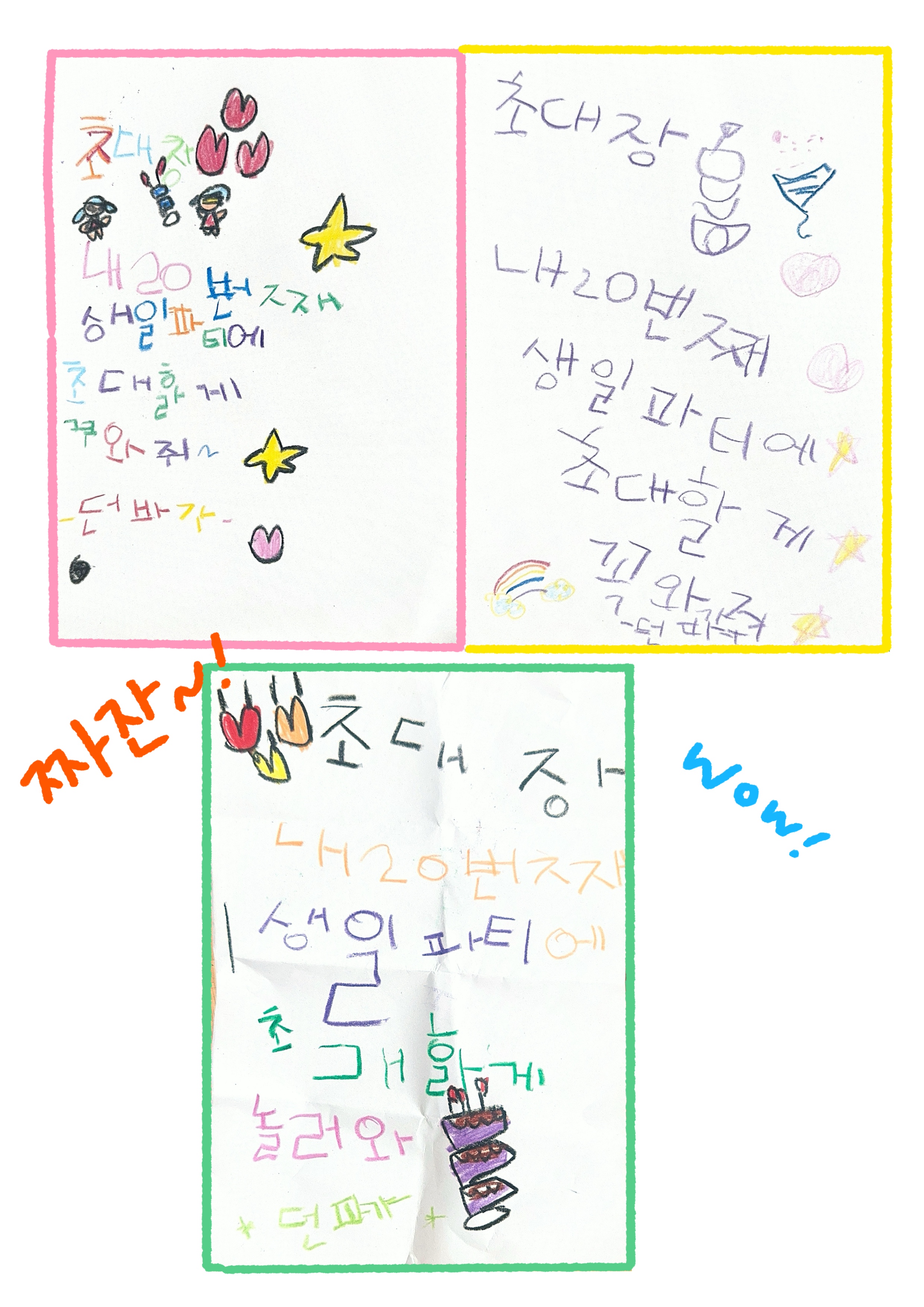 T : (다 쓴 초대장을 들며) 이거는 선생님이 다시 가져갈게^^... 새로 하자^^...