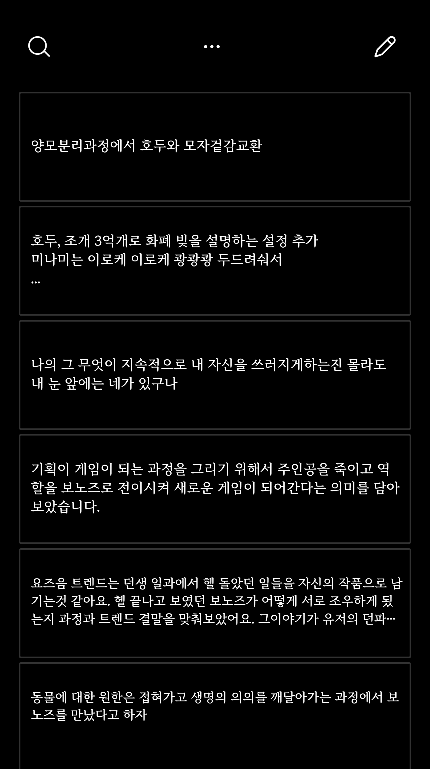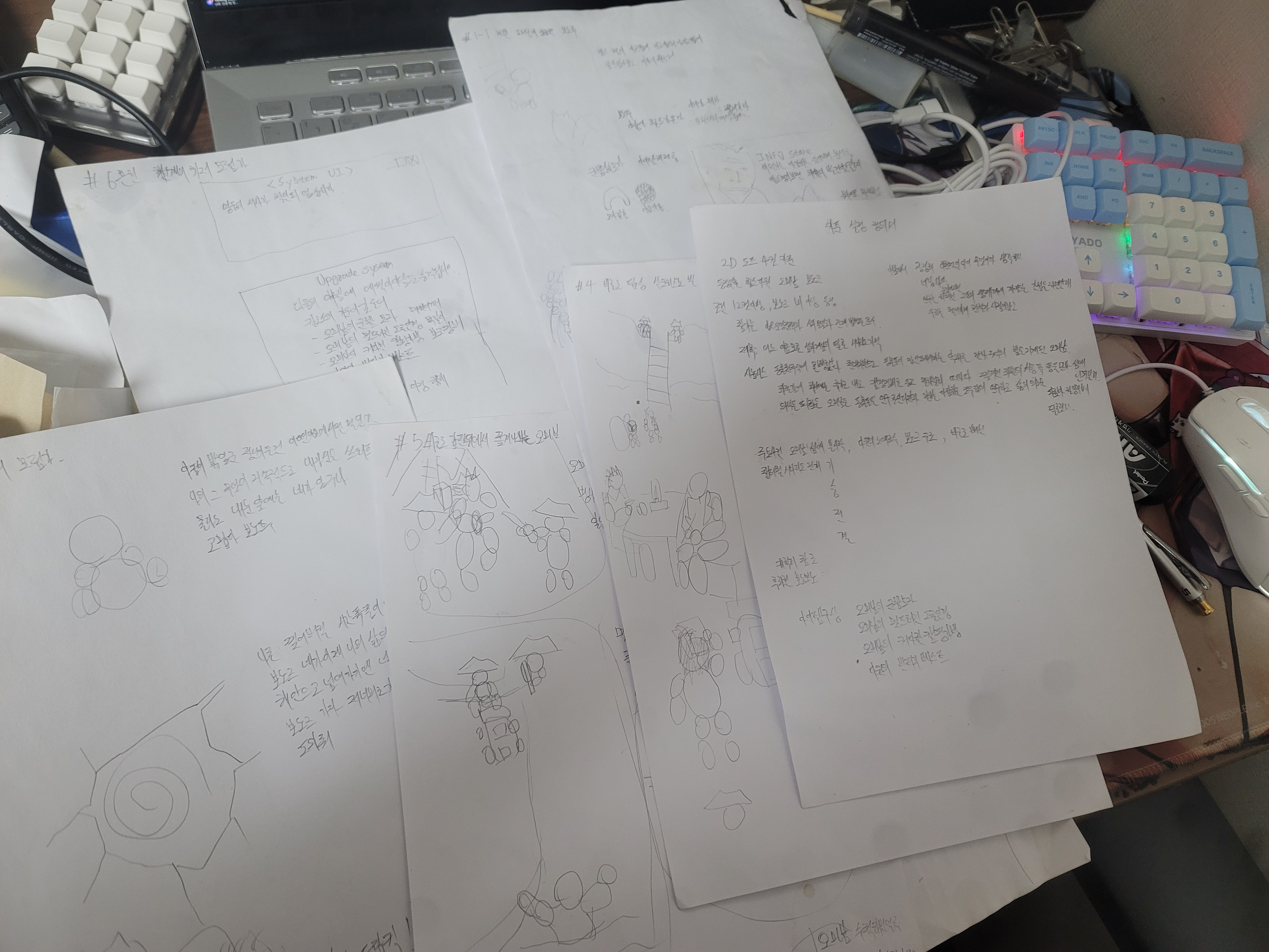 1. 아이디어 종이에 써보고 정리하기 - 2. 기존에 썻던 기획서 참조해보기- 3.자다가 아쉬워서 생각난 것들 메모하기 - 4. 에이스프라이트로 무작정 그리기