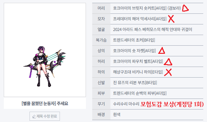 △표시를 한 부위는 새로 추가된 보안 서비스 관련 보상으로 일단 한 세트 받을 수는 있는 타입의 아바타