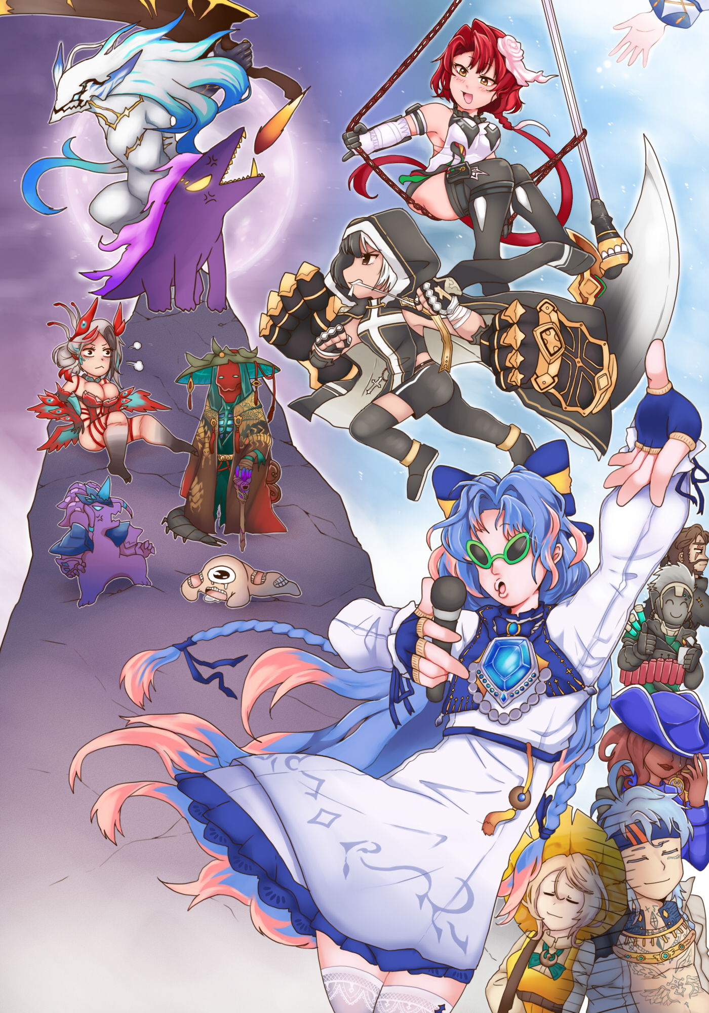 배경색은 디레지에가 침범하여 혼란한 상황이라 독기를 품은 보라색 하늘을 표현했는데 모험가의 뒤편에는