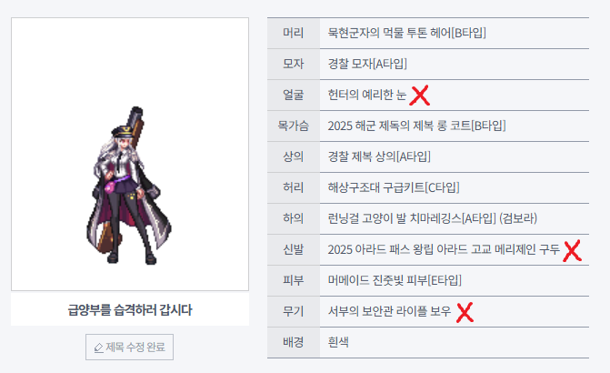 X표시한 부위는 현재 구할 수 없는 아바타입니다. (신발은 트렌드세터 구두 등으로 대용 가능합니다)