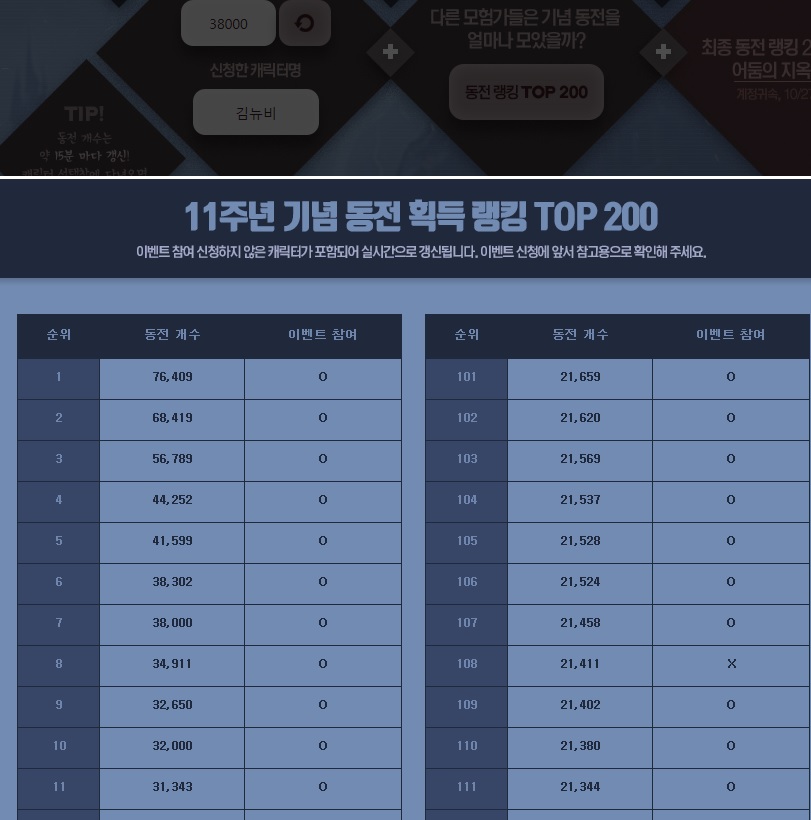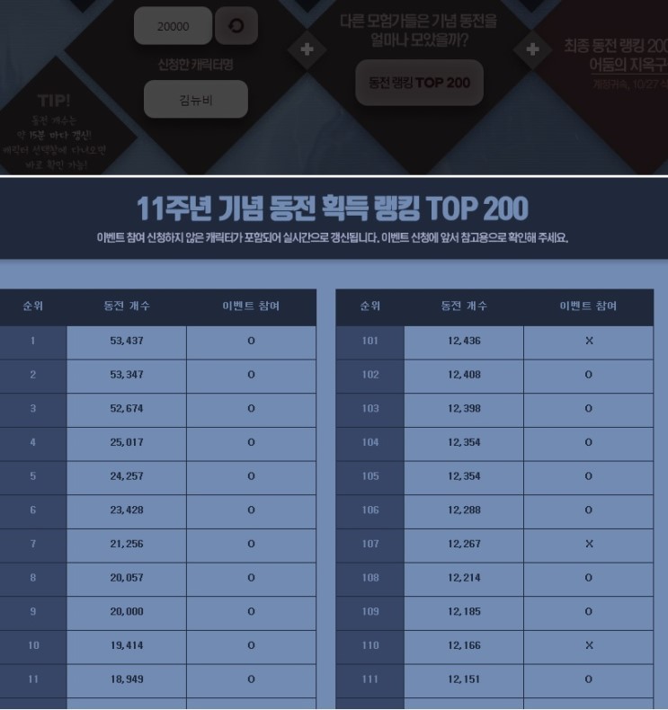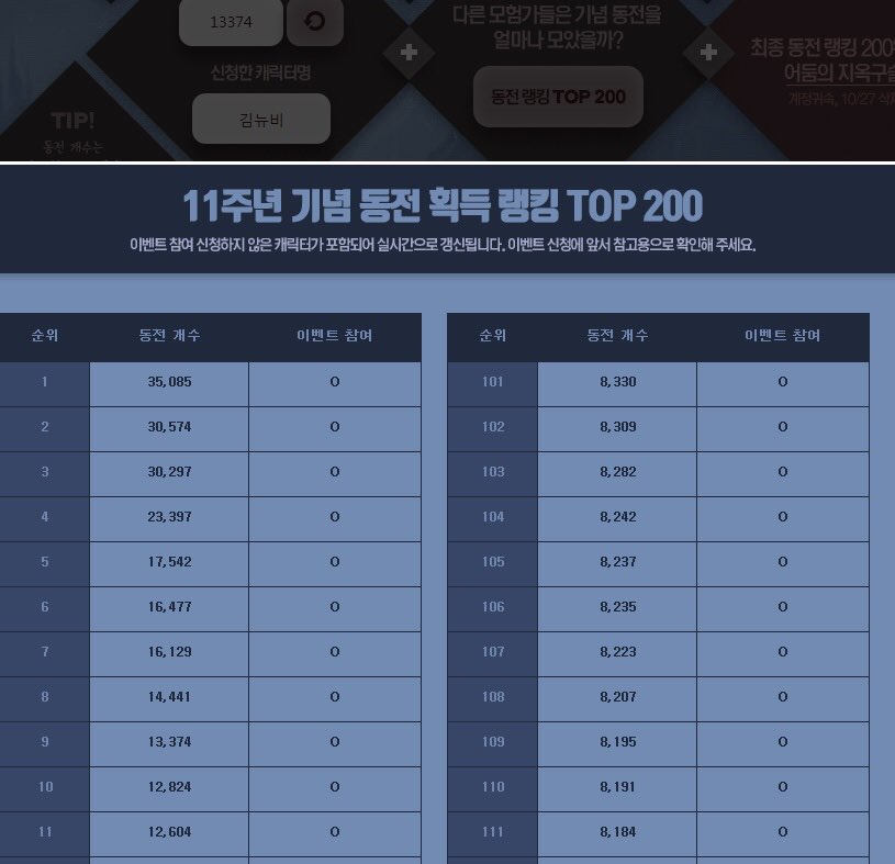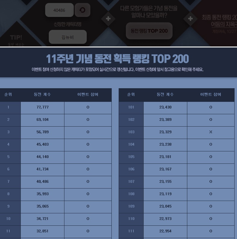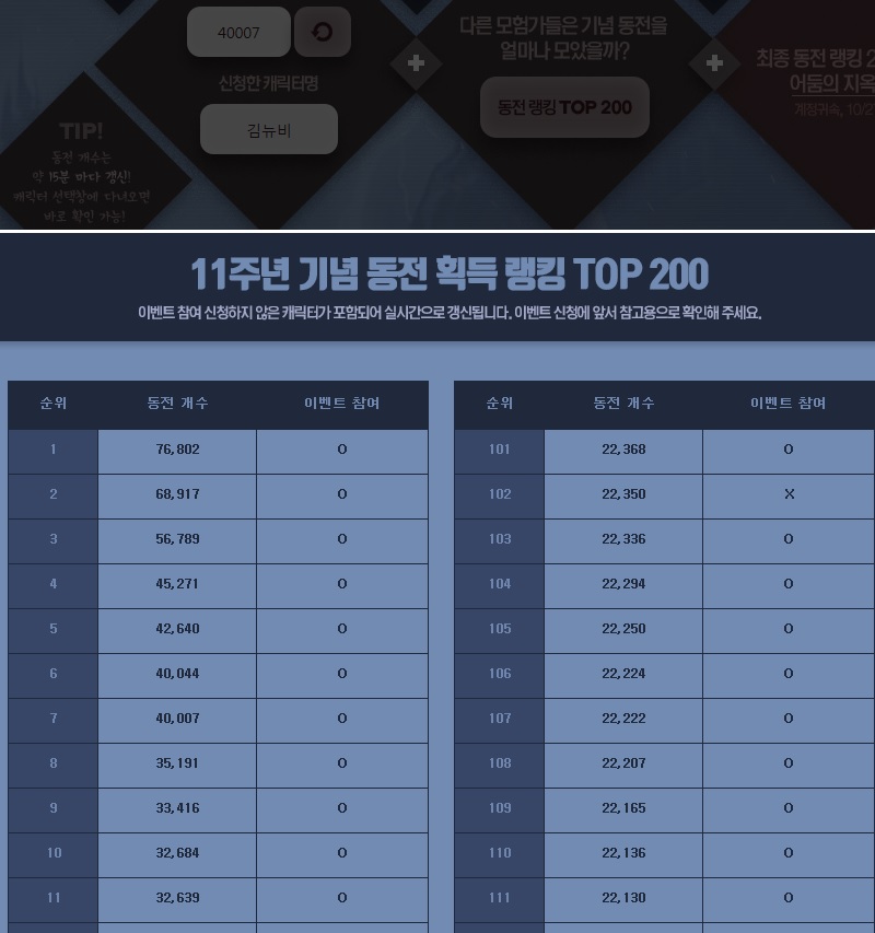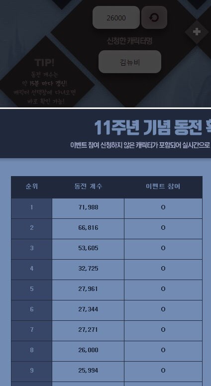 그와중에 1,2위분들 동전갯수 ㅎㄷㄷ.... 저분들의 압도적인 동전 갯수를 보고 오히려 포기할까 부터 생각했죠