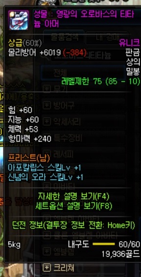 85제 판금 성물상의인 영광의 오로바스의 티타늄 아머는 각성1기인 아포칼립스를 +1 올려준다. 영축세팅에 관심이 간다면
