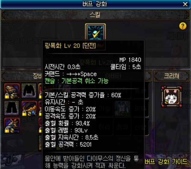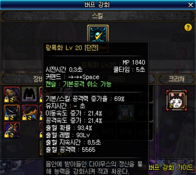 디어사이드는 20렙에 "광폭화"라는 버프스킬이 있습니다.