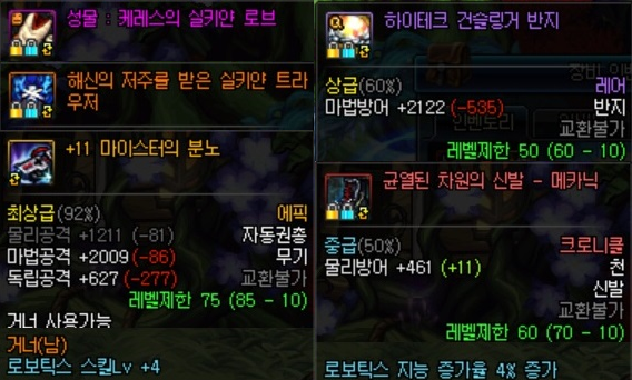 스킬레벨이 붙는 케레스의 실키얀로브, 해신하의(퀘전더리), 하이테크 반지를 기본적으로 구해주고