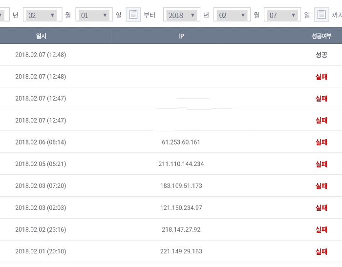 지워진 ip 4개는 내가 한거고 나머지는 전부 해킹시도