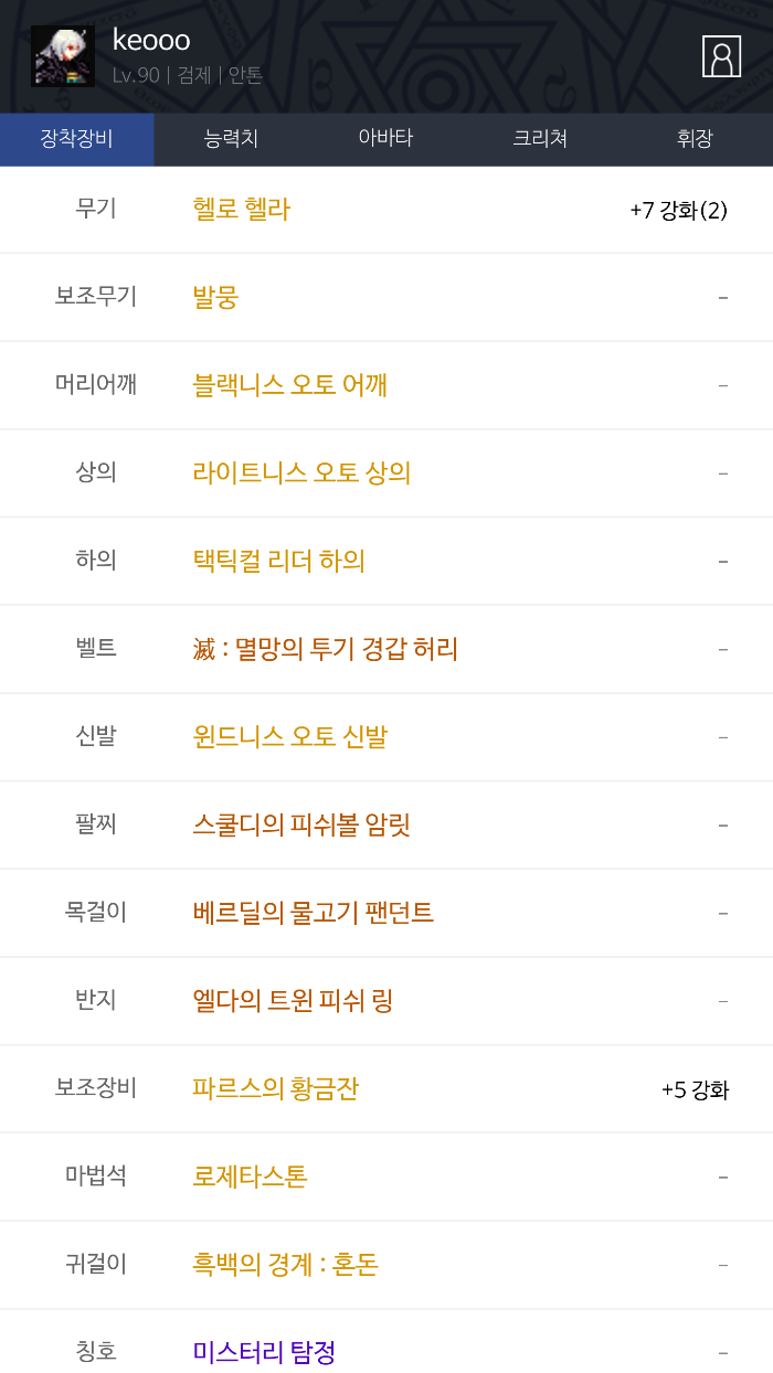보기 전직 1차 각성 2차 각성 전체 전직 전체 전직 귀검사(남) 웨펀마스터 소울브링어 버서커 아수라 검귀 귀검사(여) 소드마스터 다크템플러 데몬슬레이어 베가본드 블레이드 격투가(남) 남넨마스터 남스트라이커 남스트리트파이터 남그래플러 격투가(여) 여넨마스터 여스트라이커 여스트리트파이터 여그래플러 거너(남) 남레인저 남런처 남메카닉 남스핏파이어 어썰트 거너(여) 여레인저 여런처 여메카닉 여스핏파이어 패러메딕 마법사(남) 엘레멘탈 바머 빙결사 블러드 메이지 스위프트 마스터 디멘션워커 마법사(여) 엘레멘탈 마스터 소환사 배틀메이지 마도학자 인챈트리스 프리스트(남) 남크루세이더 인파이터 퇴마사 어벤저 프리스트(여) 여크루세이더 이단심판관 무녀 미스트리스 도적 로그 사령술사 쿠노이치 섀도우댄서 나이트 엘븐나이트 카오스 팔라딘 드래곤나이트 마창사 뱅가드 듀얼리스트 드래고니안 랜서 다크 랜서 총검사 히트맨 요원 트러블 슈터 스페셜리스트 아처 뮤즈 트래블러 헌터 비질란테 키메라 다크나이트 다크나이트 크리에이터 크리에이터 공통 공통