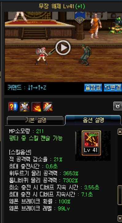 가이아로 전직시 항상 최대충전으로 적용.   정자극기준 쿨 4.8초 디버프지속7.1초