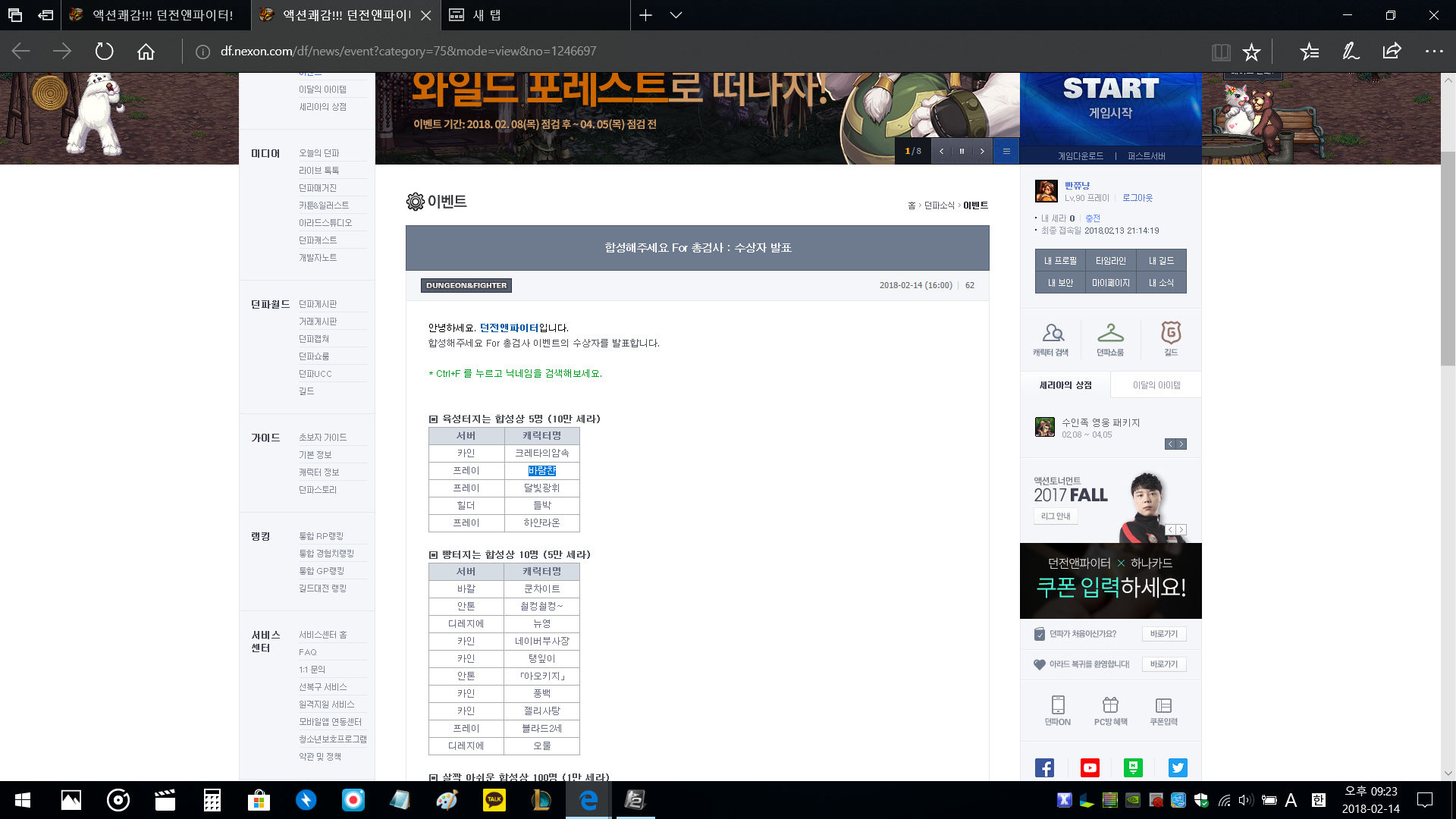 공지 [상시이벤트] 2월 묻고답하기 이벤트 안내 (1월 답변왕 발표) 던전앤파이터 2026.02.12 3,698 1 공지 내 전직 가이드 작성/갱신 이벤트 (2/12 ~ 2/26) (11) 던전앤파이터 2026.02.12 5,026 3 공지 2025 던파페스티벌 20th Anniversary 발표 요약 던전앤파이터 2025.11.22 221,939 25 공지 장비 / 플레이 / 뉴비 정보 모음 (222) 던전앤파이터 2025.04.24 999,999+ 118 공지 던전 공략 모음 (디레지에 레이드) (182) 던전앤파이터 2025.11.26 999,999+ 142 공지 전직 별 가이드 모음 (25/02/23 갱신) (756) 던전앤파이터 2026.02.23 999,999+ 399 토론 [공통] 이번 설, 무정부 상태 온다 축복소마 2018.02.15 866 1 수다 [공통] Floating for Youtube 크롬 삭제하니까 같이 삭제되네 fkoffopff 2018.02.15 1,239 0 수다 [공통] 지금은 광부안하고 헬돌려야지 BlueSapphire 2018.02.15 752 0 수다 [공통] 왜들 영곶에 민감하신지 (6) 저서비 2018.02.15 1,172 0 수다 [공통] 전 죄가 없어여 (2) 티리시스 2018.02.15 899 0 수다 [공통] 님들 내일부터 피로도2배임 (6) BlueSapphire 2018.02.15 1,060 0 수다 [공통] 나는 초월할 방어구 있어서 다행이야 (2) 화추약해양 2018.02.15 903 0 수다 [공통] 중갑하의 다찜빔설정할까 (5) 어벵흰쥐 2018.02.15 920 0 수다 [공통] 일단 한달에 조각10퍼씩만 올려도 ㅅㅌㅊ라고 생각함 (2) BlueSapphire 2018.02.15 935 0 수다 [공통] 전 황갑 3셋도 너무 늦게 달성해서 그런지.. (7) 삶에관한명상 2018.02.15 956 0 수다 [공통] 그럼 이제 이 심란함을 가득 품고 헬돌리러감 (4) 고라임즈™ 2018.02.15 852 0 수다 [공통] 영곶해제가 문제가 아니다 (3) 어벵흰쥐 2018.02.15 855 0 수다 [공통] 생각해보니 오늘 찜빔으로 설정한 90제 판금신발 먹음 (2) 요원야캐양 2018.02.15 978 0 수다 [소환사] 자이기는 아니지만.. (1) gomsuny 2018.02.15 1,410 0 수다 [공통] 그나마 악세는 졸업부분인지라 좀 괜찮다 (2) BlueSapphire 2018.02.15 939 0 수다 [남크루세이더] 이 짓을 드디어 해냈습니다.. (2) G킹*락스퍼 2018.02.15 1,773 0 수다 [공통] 왼쪽이든 오른쪽이든 에픽풀아니면어떰 (1) BlueSapphire 2018.02.15 840 0 수다 [공통] 무녀는 그래도 노황홀이니 되려다행임 (1) 서민계층 2018.02.15 849 0 수다 [공통] ㅋㅋㅋㅋㅋ 쩔인데 (6) 실수 2018.02.15 810 0 수다 [공통] 난 3캐릭을 무탐을 만들어도 ㅈㄴ 심란함 (6) 고라임즈™ 2018.02.15 937 0