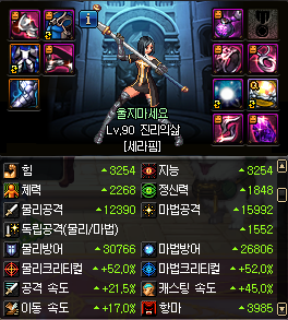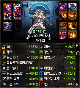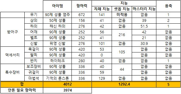 장비만 착용한 상태고, 기억의 룬스톤 대신 성물법석에 10강 기운을 착용했습니다. (그 덕에 표에 있는 항마보다 30가량 낮습니다.)