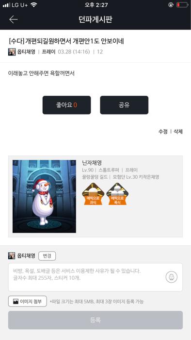 공지 [상시이벤트] 1월 묻고답하기 이벤트 안내 (12월 답변왕 발표 / 진 답변왕 인장 지급 안내) 던전앤파이터 2026.01.08 6,509 5 공지 [수상자 발표] [디레지에] 레이드 정보/공략 작성 이벤트 수상자 안내 던전앤파이터 2026.01.08 6,265 0 공지 2025 던파페스티벌 20th Anniversary 발표 요약 던전앤파이터 2025.11.22 218,120 24 공지 장비 / 플레이 / 뉴비 정보 모음 (222) 던전앤파이터 2025.04.24 999,999+ 116 공지 던전 공략 모음 (디레지에 레이드) (180) 던전앤파이터 2025.11.26 999,999+ 141 공지 전직 별 가이드 모음 (25/02/05 갱신) (754) 던전앤파이터 2026.02.05 999,999+ 397 질문 [공통] 비탄탑 이벤트 누구줄까 고민돼요 (2) 유탄미미누나 2018.04.01 1,330 0 수다 [공통] 퉷 (1) 보스냥 2018.04.01 1,018 0 수다 [공통] 6번째 광부시작 (3) BlueSapphire 2018.04.01 1,245 0 수다 [공통] 만우절이랍시고 다들 잘 논다 (14) 고라임즈™ 2018.04.01 1,335 0 수다 [공통] 혐짤들 다 신고함 ㅡㅡ 보스냥 2018.04.01 725 0 수다 [공통] 이것도 만우절? (4) #조토리 2018.04.01 1,443 0 수다 [공통] 와씨... (3) 보스냥 2018.04.01 999 0 수다 [공통] 으어어어어 (10) Dublas 2018.04.01 1,171 0 수다 [공통] 탈던기념 야짤달린다 (4) 끈적한팔라딘 2018.04.01 1,814 0 질문 [여넨마스터] 싱글루크 가능할까요?? (1) 루케티아 2018.04.01 1,321 1 수다 [공통] 씹인싸 특) (2) 어벵흰쥐 2018.04.01 930 0 질문 [남레인저] 스타일리쉬 (2) 올에픽후닉변 2018.04.01 1,304 0 수다 [공통] 고라임아조시 질문 (6) 수동식빙수기 2018.04.01 880 0 수다 [공통] 던파 접음 ㅅㄱ (7) 끈적한팔라딘 2018.04.01 1,430 0 수다 [공통] 아몰라 안톤 진짜 안해 (5) Gravitation 2018.04.01 1,321 0 수다 [공통] 갑자기 들어온 속보! (20) 복치개복치 2018.04.01 1,514 0 수다 [공통] 오늘은 (10) 에픽죠 2018.04.01 931 0 수다 [공통] 고-급광부까지 40일남음 (2) BlueSapphire 2018.04.01 1,455 0 수다 [공통] 어차피 졸업학년인데 저거 또해볼까 (2) Gravitation 2018.04.01 1,083 0 수다 [공통] 오늘 만우절 아닌데? (3) #조토리 2018.04.01 958 0