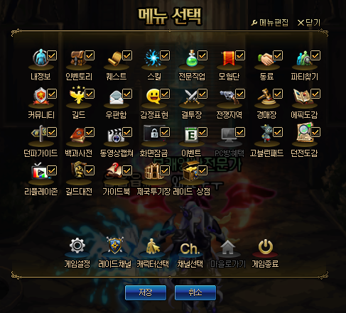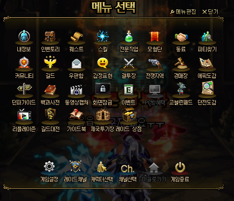 게임 내에서 ESC를 눌렀을때 나오는 메뉴창을 간단하게 정리하는 법입니다!!