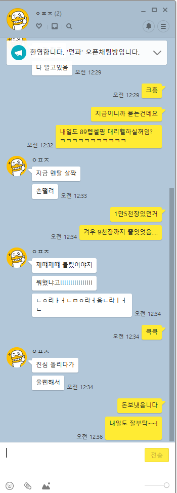 공지 [이벤트] 천해천 공략 이벤트 기간 연장 안내 던전앤파이터 2026.03.26 4,908 3 공지 던파로ON : 천해천 발표 요약 던전앤파이터 2026.03.07 21,394 15 공지 [상시이벤트] 3월 묻고답하기 이벤트 안내 (2월 답변왕 발표) 던전앤파이터 2026.03.12 5,690 0 공지 장비 / 플레이 / 뉴비 정보 모음 (224) 던전앤파이터 2025.04.24 999,999+ 121 공지 던전 공략 모음 (천해천 상급 던전) (187) 던전앤파이터 2025.11.26 999,999+ 145 공지 전직 별 가이드 모음 (26/03/03 갱신) (769) 던전앤파이터 2026.02.27 999,999+ 402 수다 [공통] 아낌없이 주는 녹도의 은혜 (2) Polar§Night 2018.04.15 1,279 0 수다 [공통] 던파 접을때 남은 유물 (4) BlueSapphire 2018.04.15 2,682 0 수다 [공통] 당시야 뭐 레어만 떠도 감격하던 순간인걸. (4) 無念 2018.04.15 1,456 0 수다 [공통] 옛날 비명굴 울티는 (2) 이름없는장미 2018.04.15 1,280 0 수다 [공통] 옛날 비명굴은 메카닉은 못갔던 곳이다 (16) 고라임즈™ 2018.04.15 1,282 0 수다 [공통] 아오 중복 수준 ㅋㅋㅋㅋ (6) Gravitation 2018.04.15 1,320 0 수다 [공통] 그러고보니 그거 언제삭제된거지 ㅠㅠ (2) 노-퓨쳐 2018.04.15 1,242 0 질문 [여스핏파이어] 크리쳐 ,아바타 및 어찌할지 질문 드리옵니다 (1) 박창구 2018.04.15 1,586 0 수다 [공통] 오리진으로 재전이 한다고 할 때 (3) 이름없는장미 2018.04.15 1,133 0 수다 [공통] 자야지 (2) 현재시간 2018.04.15 1,003 0 수다 [공통] 비교적 최근에 있었던 재밌는거 (6) BlueSapphire 2018.04.15 1,862 0 수다 [공통] 홀백토 환영 (4) Polar§Night 2018.04.15 1,324 0 수다 [공통] 다들 고였네 (1) 현재시간 2018.04.15 1,007 0 수다 [공통] 빌마쩔받을때 그래플러 ㅈㄴ많이보였는데 (5) BlueSapphire 2018.04.15 1,235 0 수다 [공통] 옛날에 잠쩔보단 (11) 노-퓨쳐 2018.04.15 1,185 0 수다 [공통] 앗....아ㅏ... (8) 악마카르젠 2018.04.15 1,330 0 수다 [공통] 옛날부터 아직도 이해안되는것 (4) BlueSapphire 2018.04.15 1,211 0 수다 [공통] 뭔가 지금 올라오는 얘기들을 보면 (1) 이름없는장미 2018.04.15 1,013 0 수다 [공통] 무한의 암살자는 대체 왜 석화가 있었을까 (4) 고라임즈™ 2018.04.15 1,592 0 수다 [공통] 와! 13강! (7) 無念 2018.04.15 1,543 0