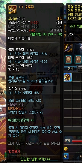 둘은 모두 90제 에픽이지만 옵션이 상당히 다르죠. 호룡담은 마칼작이 되지 않아 앞뎀이 6정도 낮은데 거의 차이가 미미하므로 넘어가겠습니다. (앞뎀 100 기준 파티플에서 3~4%정도의 데미지 차이를 보입니다)