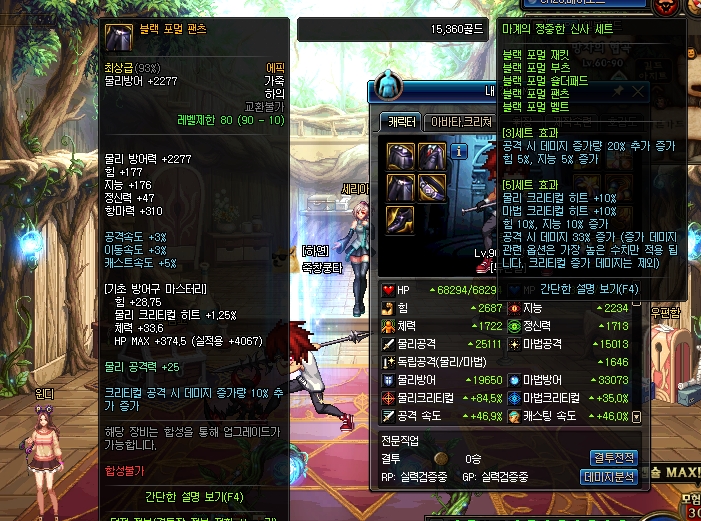 정확한 비교를 위해 나머지 부위를 모두 뺐으며, 기존에 있던 속성강화를 메우기 위해 속강버프는(쉐도우헌터의 모속강 26을 위해) 주었습니다.