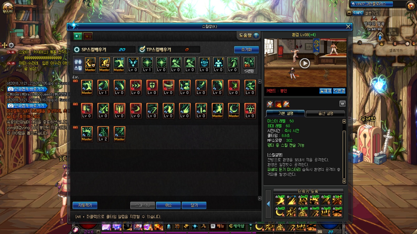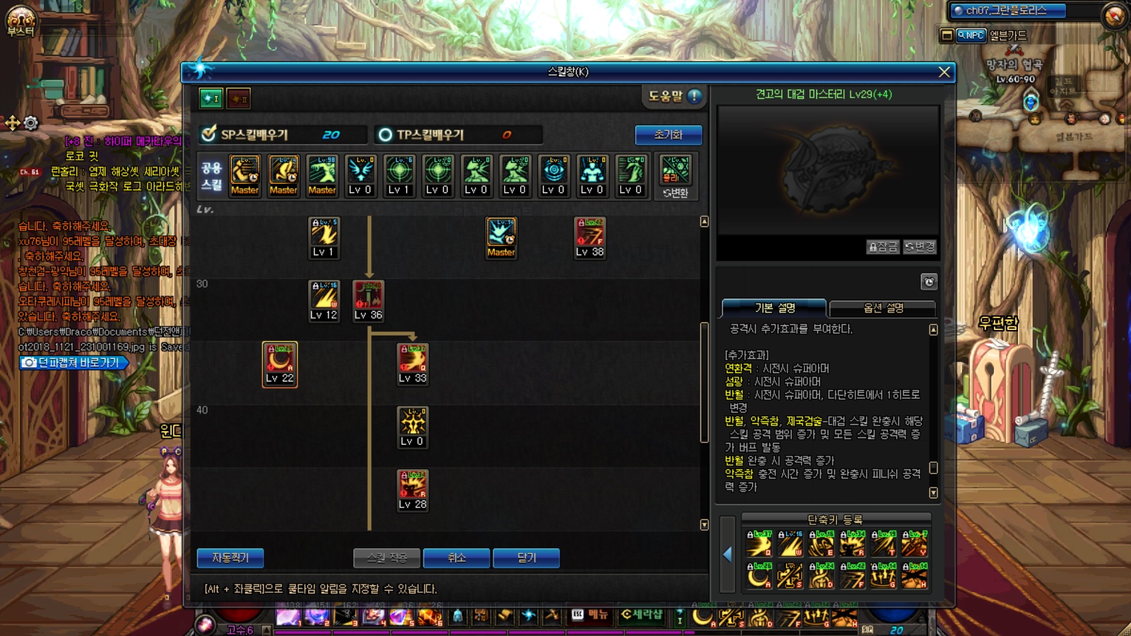 신검합일 : 버프입니다. 스포로 투자할 수 있는 마스터 레벨은 10이지만 최대 레벨은 20이고, 레벨이 올라갈 때마다 전반적인 딜이 상승하므로 아이템 스위칭을 해서 20레벨(당장 버겁다면 20레벨에 가깝게라도)에 맞춰줘야 합니다.