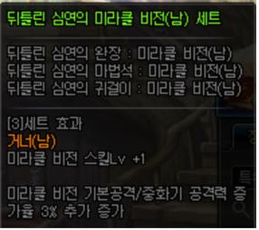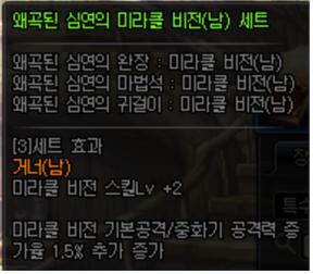 왜곡된 : 레벨링 2와 더불어 공증을 추가로 주는 중간 스위칭입니다. 왜곡된 세트를 제외한 미비 최대 레벨에서 1~2 모자라거나, 12부위 외 레벨링이 4~6 정도 되는 분들을 위한 것들입니다. 주로 3렙 칭호가 너무 부담스럽거나, 때를 놓쳐 극스위칭에 한 두 부위가 빠진 분들을 위한 세팅이라고 보면 됩니다. 다양한 경우를 대비해 중간세팅을 배려한 의도네요.