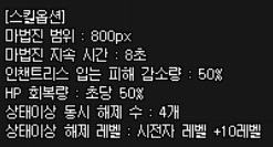 - 범위 내 파티원들의 HP가 지속적으로 회복되고 모든 상태이상이 삭제됩니다.