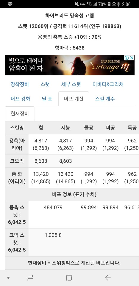 아바타는 지능부분만 찬작이며 오라는 순금식기이고 무기클압 보유중인 캐릭터입니다.