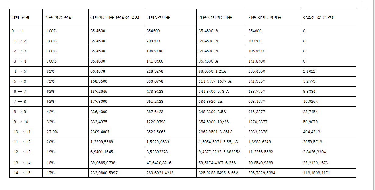 오던 만화때문에 재미로 계산해 봤음. 이전에 까발려진 바로는 강화의 비밀의 강화확률 증가량은 1%