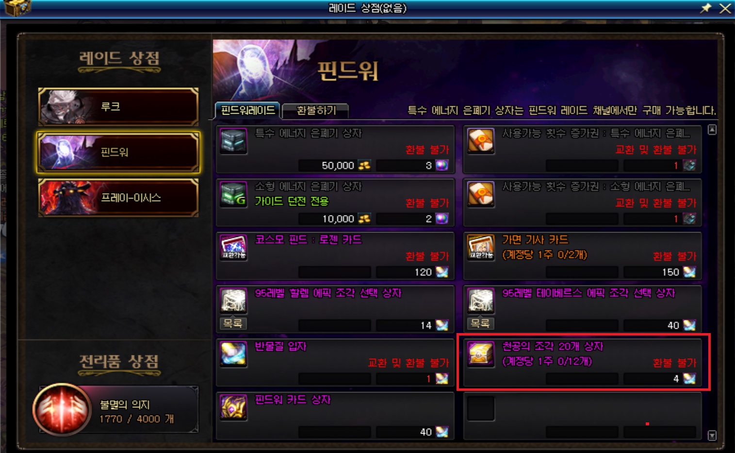 핀드워 레이드 상점에서 일주일에 천공의 조각 240개를 구매할 수 있습니다.