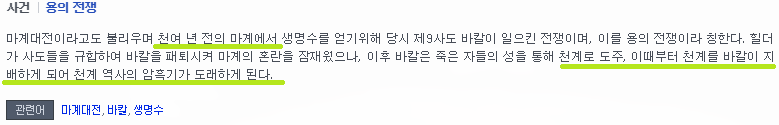 먼저, 용의 전쟁은 바칼이 마계에 있을 적에, 영원수(=생명수)를 얻기위해