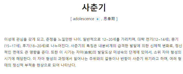 위와 같이 사춘기는 12살~20살 사이를 칭하는 나이입니다.