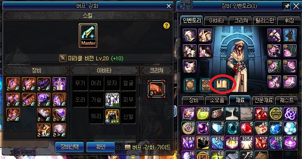아래 그림 처럼 인벤토리 창을 켜면 버프 강화라고 3번 째 책이 있습니다.