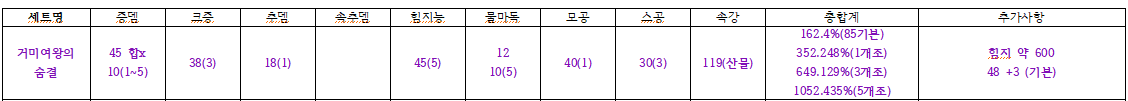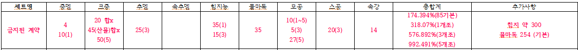 총평: ​위의 거미여왕과 비교해서 공캐속은 높지만 입장 체력을 까먹는 등의 옵에서 눈살이 찌푸려지는 셋입니다. 물론 회복옵이 있긴하지만 쿨이 3분.. 그런셋이 종합적으로 딜량이 거미여왕보다 장점이 없습니다. 물마독 254로는 거미여왕의 속강 이점과 1각패 레벨링에 비해 장점이라 하기는 택도 없죠. 무엇보다 원 셋이 가진 크증 중첩불가가 2중으로 적용되는 슈퍼 개그 옵션. 100제들도 크증 높으면 티어가 떨어지고 앉아있는데 95%나 되는 크증, 그러면서 스공은 20 등 단점이란 단점이 몽땅 산재한 세트입니다.