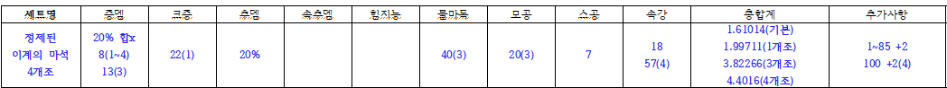 총평 : 위의 정마반 과는 달리 스공과 속강등 옵션 밸런스에 초점을 맞춘 셋입니다. 물론 그렇게 해놓고 지가 모공 86% 줘서 망친다는게 문제지만요. 그리고 수속강 고정이 된다는 점도요. 하지만 템 패널티가 없고 혼란등 귀찮은 옵이 안 붙는 다는 점은 큰 장점입니다.