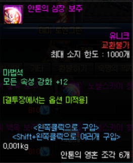우선 안톤토벌전에서 얻을 수 있는 심장보주인데요. 안톤토벌전 클리어시 가끔씩 주는 애물단지 영혼조각 6개를 모으셔서 구매하시면 되는 보주입니다.
