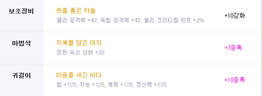 현재 필자가 착용하고 있는 장비인데요 보조장비/마법석은 7증폭으로 10강의 효율을 이기기 떄문에 7증폭을 하셔도 무방하지만, 귀걸이의 경우는 10강이 9증까지 이기니 돈이 많으신게 아니라면 귀걸이는 강화로 넘어가시는게 좋습니다. 저는 흑우같이 똥묻은 귀걸이에 마부해서 울며 겨자먹기로 10증을 했습니다 ;ㅅ;