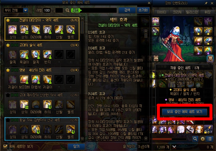 이번주 패치에서 적용될 보유 중인 에픽 세트 보기 기능입니다.