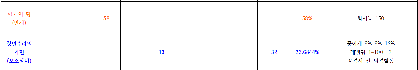 위의 산물 평균 58%와 올 레벨링 2를 받은 청면수라의 옵션 차이는 약 27.7%입니다.