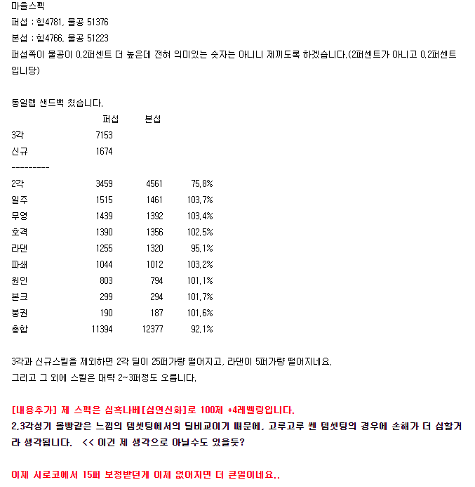 그래서 저는 퍼섭 본섭 25초 50초 100초 딜? 실험을했습니다.