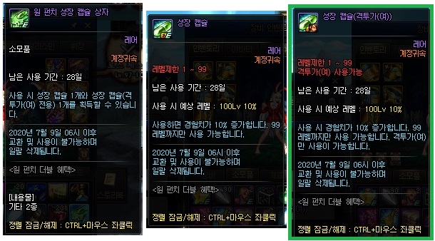 앞의 이벤트를 통해 얻을 수 있는 레벨 상승권과 성장 캡슐을