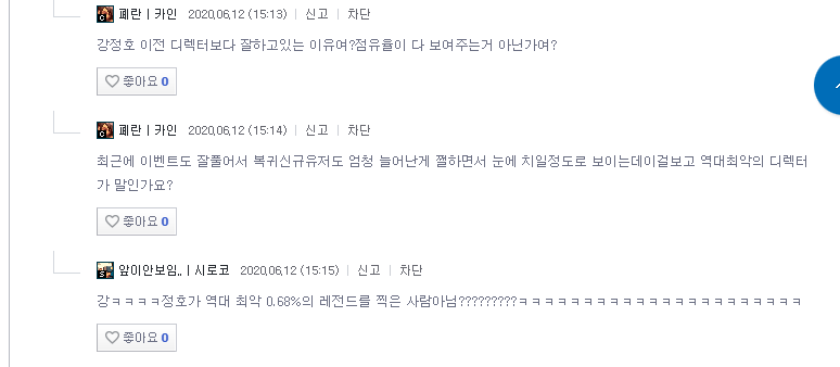 강정호가 젤 나은 디렉터라고 ? 점유율 보라고 ? ㅋㅋㅋㅋㅋㅋㅋㅋㅋㅋㅋㅋㅋㅋㅋㅋ 자 . 우리 던저씨들과 대빵님들에게 여쭤보겠습니다 강정호가 현 상황에서 젤 나은디렉터입니까?