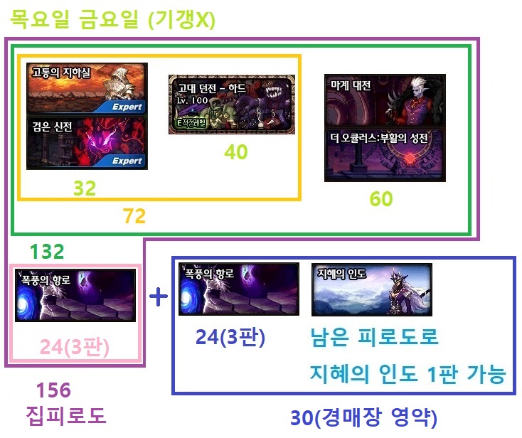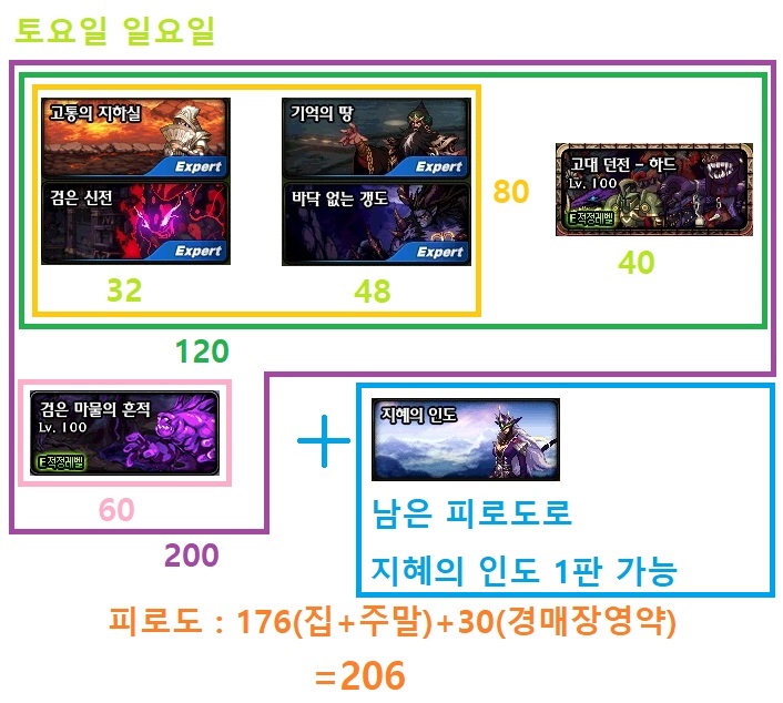 지하실 2회 + 신전 2회 다 도는데 피로도 32 필요 | |||