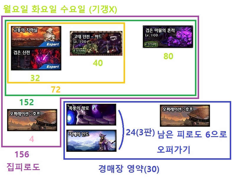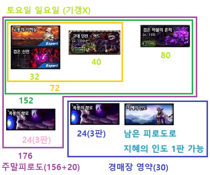 주간 컨텐츠 *일일 횟수/총 횟수 요구 입장 피로도 (총 소모 피로도) |