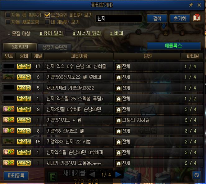 위에 빈칸에 신지 를 검색하시면 해당 키워드가 들어간 쩔파티 / 일반 파티가 쭈욱 나옵니다