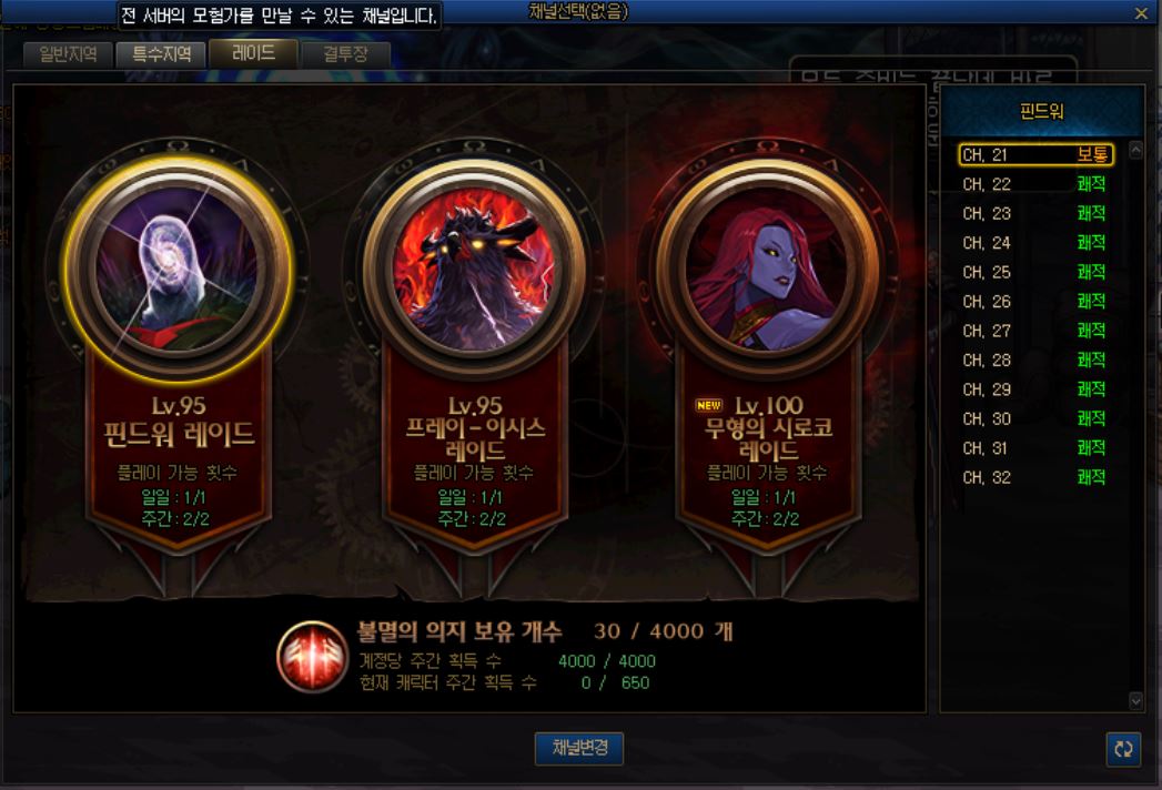 ESC -> 레이드 채널 -> 핀드워 레이드 입장이 가능해집니다
