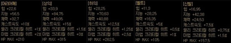 지능 : 282.51, 캐스트속도 : 10%, 마법 크리티컬 : 10%, 정신력 : 218 (힘 : 113, 물크 : 5%)