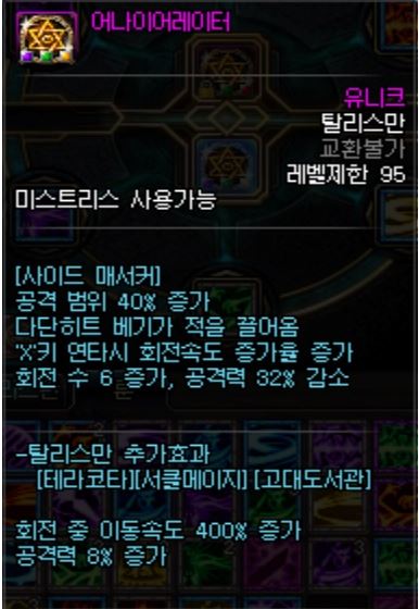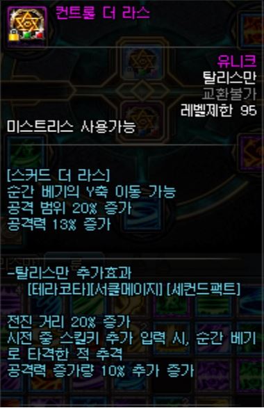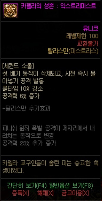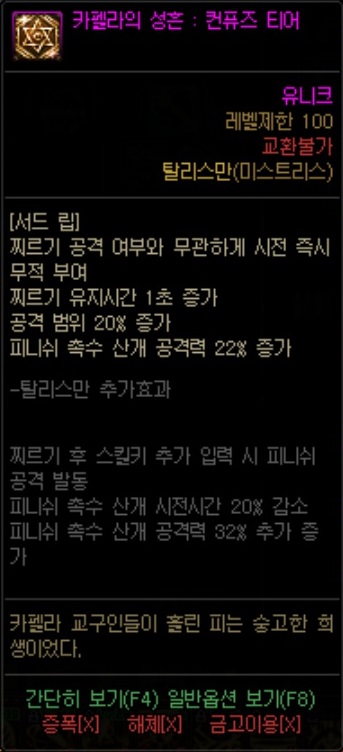 - 원본 스킬은 스킬이 적중해야 무적상태가 되는데, 그런 조건부를 삭제시켜주며 피니쉬 공격도 자유롭게 발동시켜주는 단점이 사라지는 탈리스만.