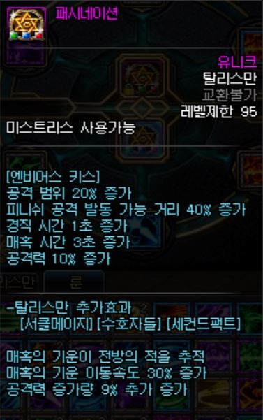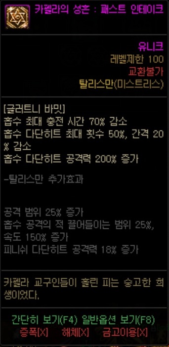 - 풀히트에 걸리는 시간을 대폭 줄여준다. 원본 스킬이 흡수 -> 방출이지만 흡수 단계를 즉발 수준으로 바꿔주는 상당히 좋은 탈리스만.