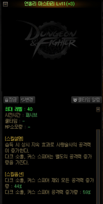 2각패시브로 무난한 스증뎀 패시브입니다. 다크소울과 커스스피어는 수치가 15퍼 높아서 이 두 스킬은 이 스킬의 레벨링 효율이 약간 떨어집니다. 현재 사령술사의 아바타 상의는 이 스킬로 하는것이 가장 좋습니다.