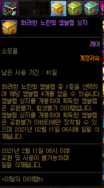 해당 상자 사용시 4개의 계정귀속 상자로 나뉘며 붉은, 노란, 녹색, 파랑상자로 나뉘며 여기서 자기가 원하는 화려 엠블렘을 선택할 수 있습니다.