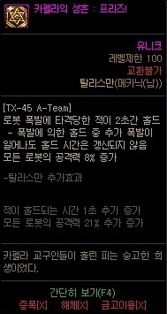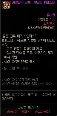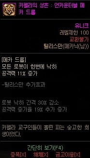단점: 고렙 던전에 홀딩불가 안달려 있는 보스몹이 사실상 없는데 홀딩이 왜 붙은지 모르겠는 쓰레기 탈리스만 입니다. 딜 증가량은 평범하지만 원본이 너무 구려서......